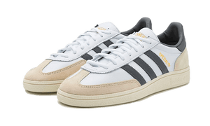 The Adidas Handball Spezial White Gray is a retro reinterpretation of the famous Handball Spezial range, presented in an elegant "White Gray" color combination. This model features a white leather base upper with Cloud White suede overlays on the heel and T-front panel. Black details stand out on the leather heel tab and three side serrated stripes, while gold metallic tones enrich the inscriptions "SPEZIAL" next to the stripes and the marking on the tongue. Completing the design is a gray inner lining, white laces, branded insoles and an Off-White sole unit with adidas branding in the middle of the rear sole, culminating in a classic and sophisticated aesthetic.