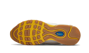 The Nike Air Max 97 Undefeated UCLA, the result of a collaboration with the sneaker and clothing brand Undefeated, stands out for its stripe with markings along the sides. This model is constructed with a white leather base while yellow and blue stripes stand out on the sides, accompanied by a white Swoosh. Underneath, a clear Max Air outsole and yellow outsole complete the design, offering unmatched comfort.