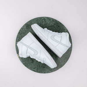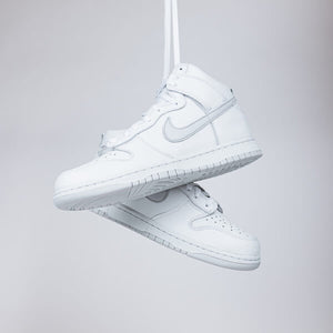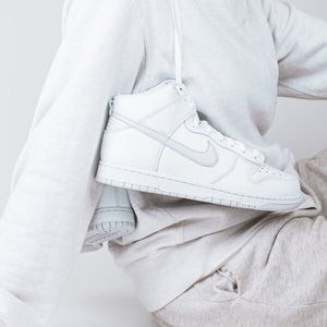 .The Nike Dunk High Pure Platinum features a white leather upper and maintains the iconic model's details. The upper matches the midsole perfectly, while a Platinum Gray side Swoosh breaks up the monochrome ensemble to match the outsole in the same way.