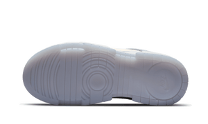 The Nike Dunk Low Disrupt Summit White Ghost features a white mesh upper highlighted by light purple grained leather overlays. A pastel pink smooth leather Swoosh, matching the tongue, enhances the play of colors, offering a soft and attractive palette.